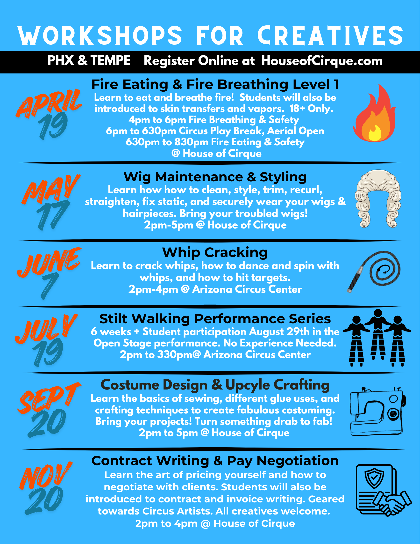 Learn from professional performers and instructors with over 20 years’ experience. Instruction available in Fire Eating, Fire Breathing, Fire Prop Manipulation & Fire Dance, Side Show, Bed of Nails, Whip Cracking, Glass Dancing, Stilts, Stilt Dance, Acro Stilts, 4 Legged Stilt Walking, Choreography, Costume & Prop Design, Contract Writing & Pay Negotiation, Performance Training, & MORE! Email info@houseofcirque.com with any questions.